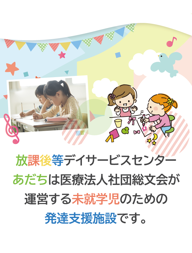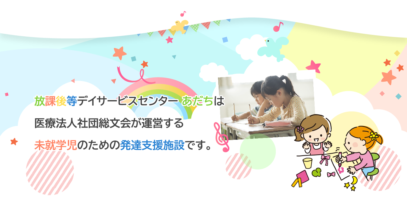 放課後等デイサービスセンターあだちでは、子どもたち自身が「楽しむ」という気持ちを大切にし、子どもたちの能力を最大限にひきだし、未来への可能性を広げ、社会の一員として「幸せ」を感じて「安心」して生活ができることを目指しています。